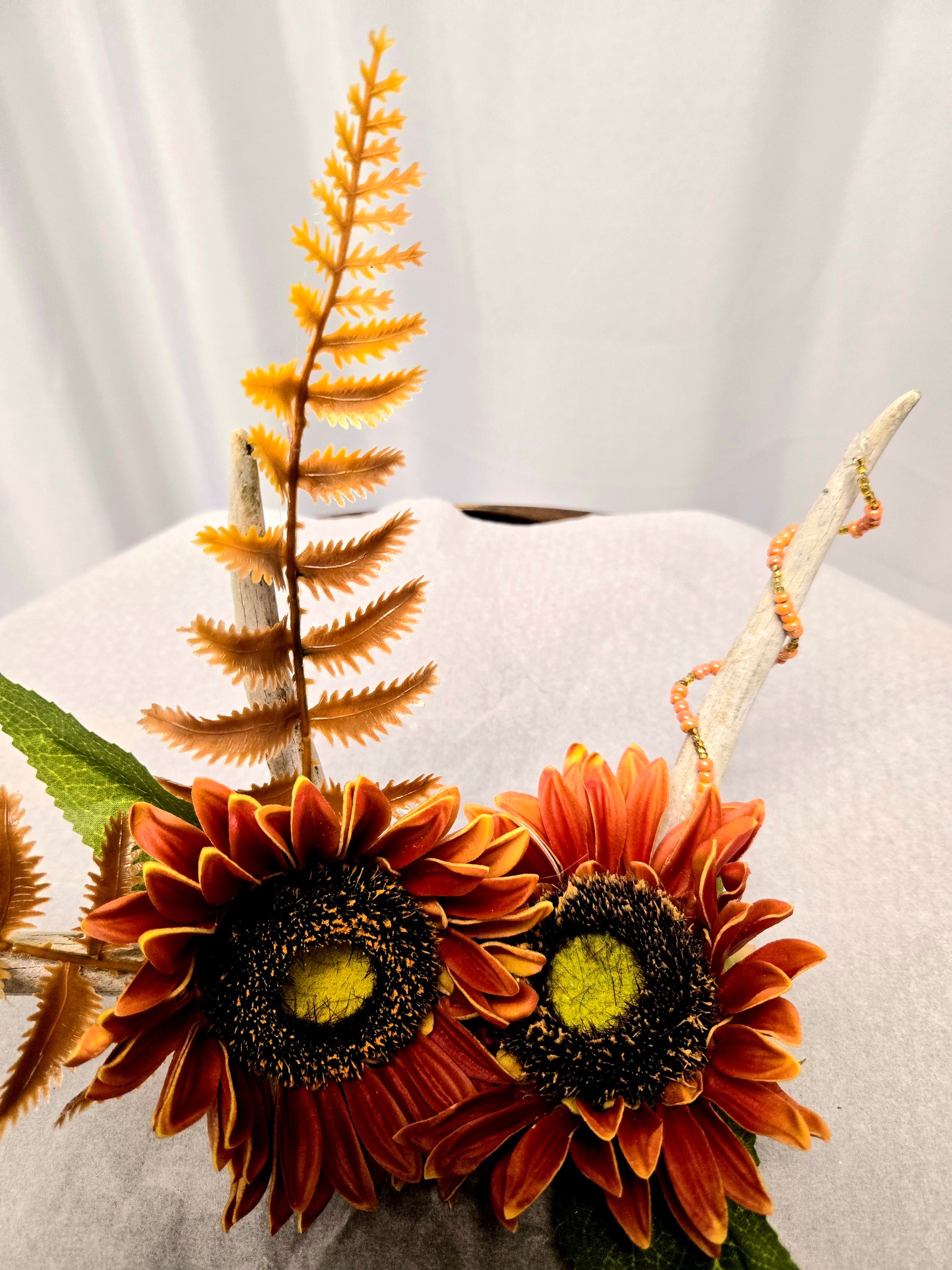 Designer, one-of-a-kind natural White-Tail Deer antler art. Embellished with florals and beads in shades of orange. Approximately 10"