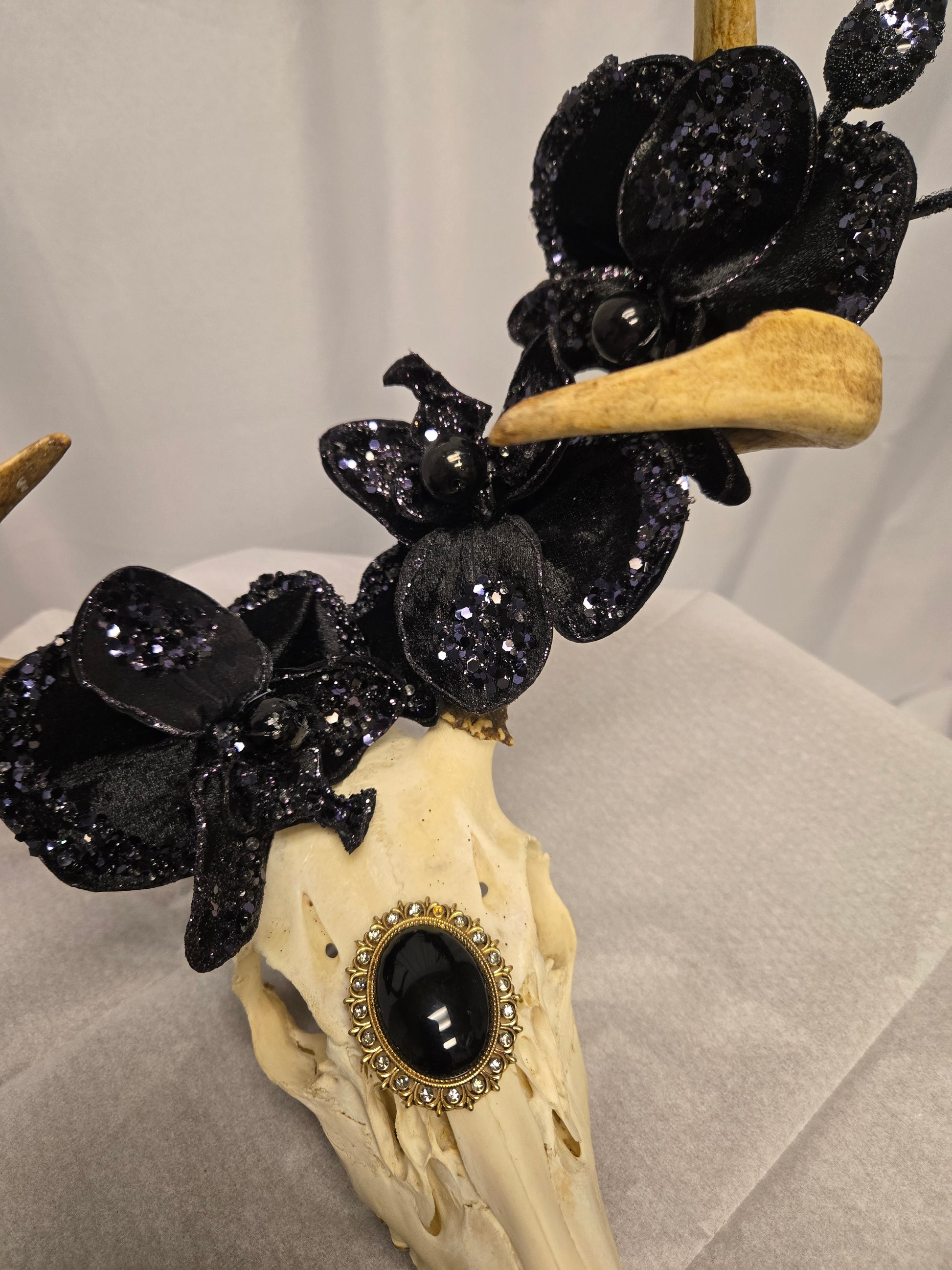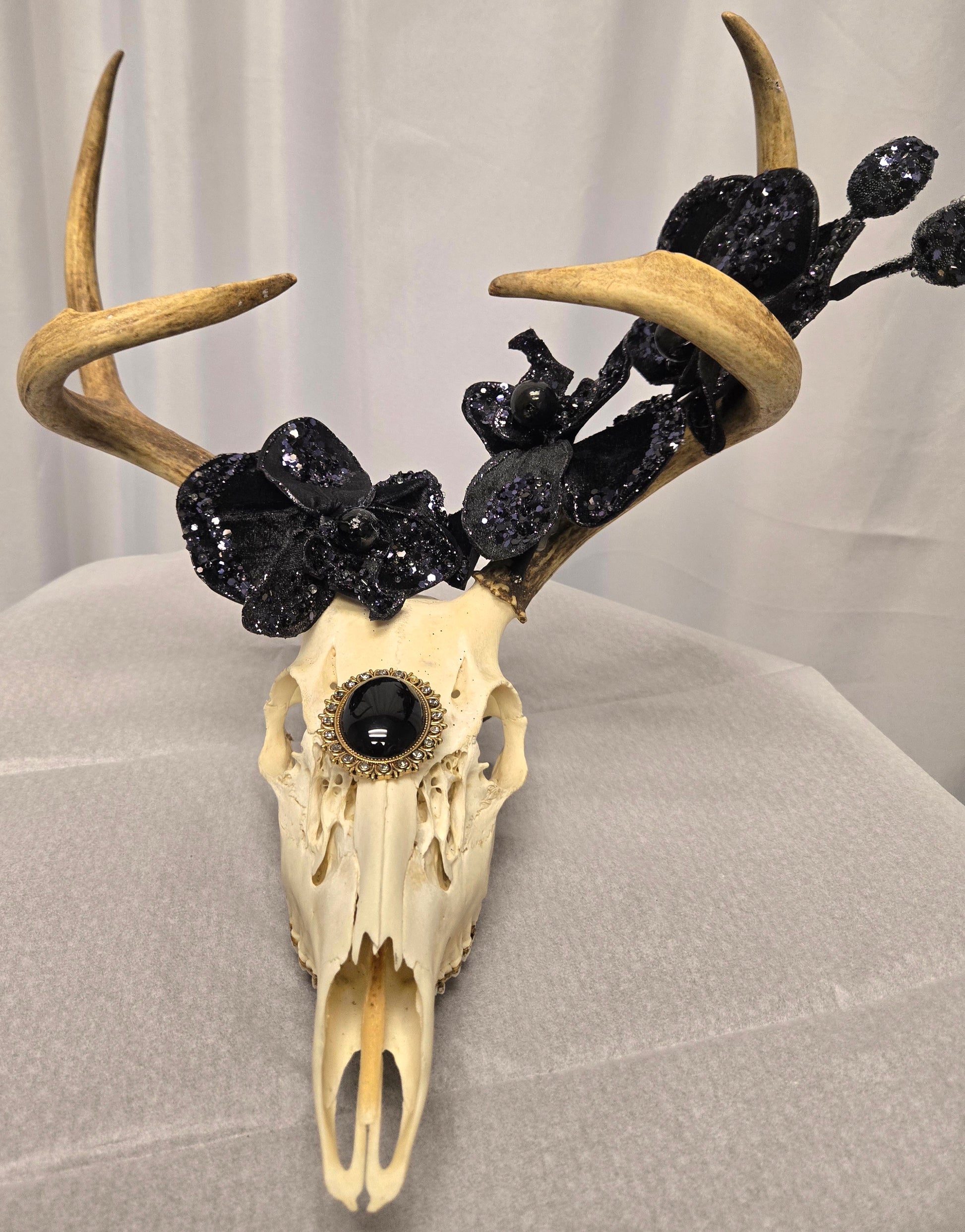 Designer one-of-a-kind natural 4-point White-Tail Deer head and antler art. Embellished with black orchid flowers and brooch. Approximately 12x13 inches.