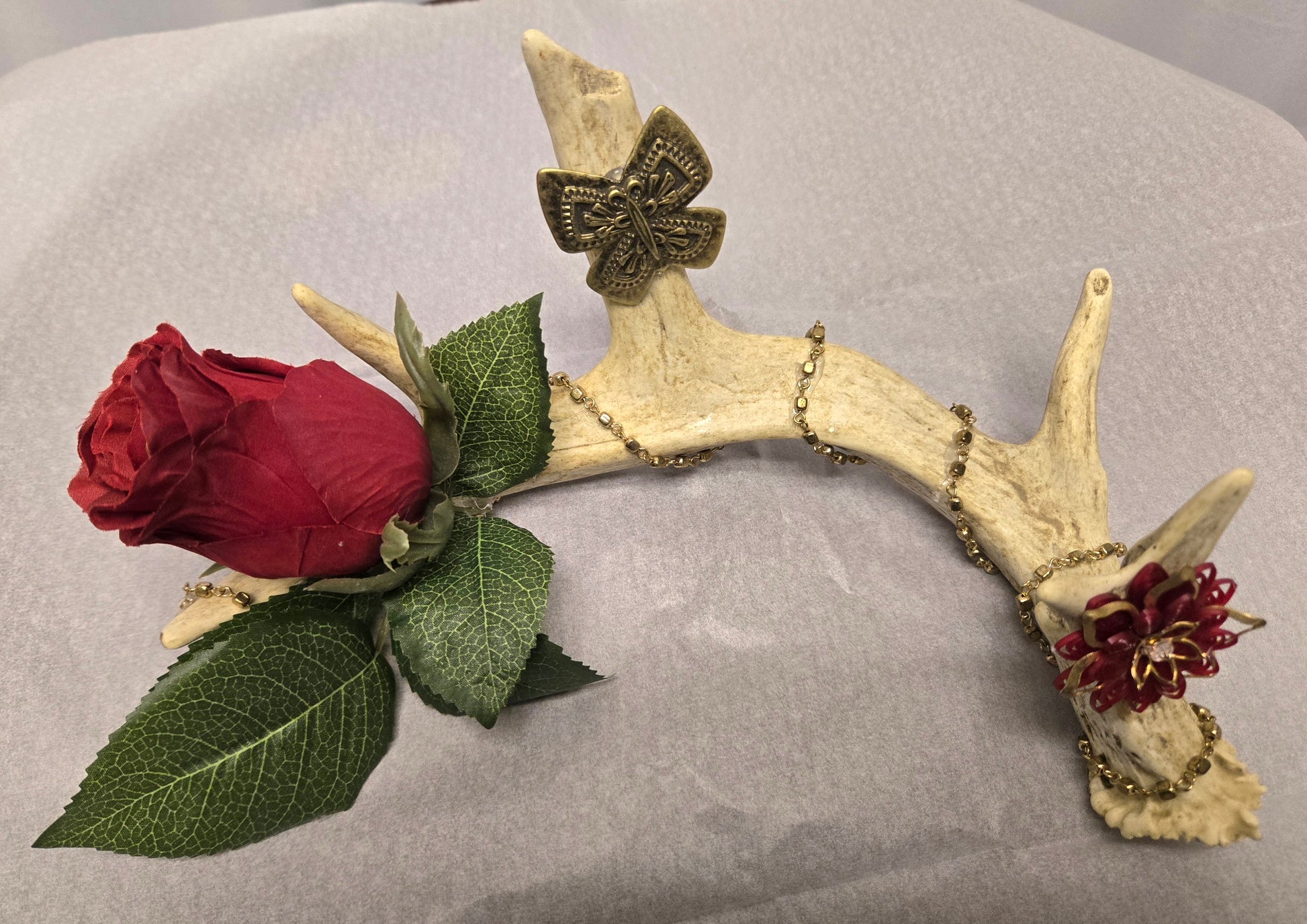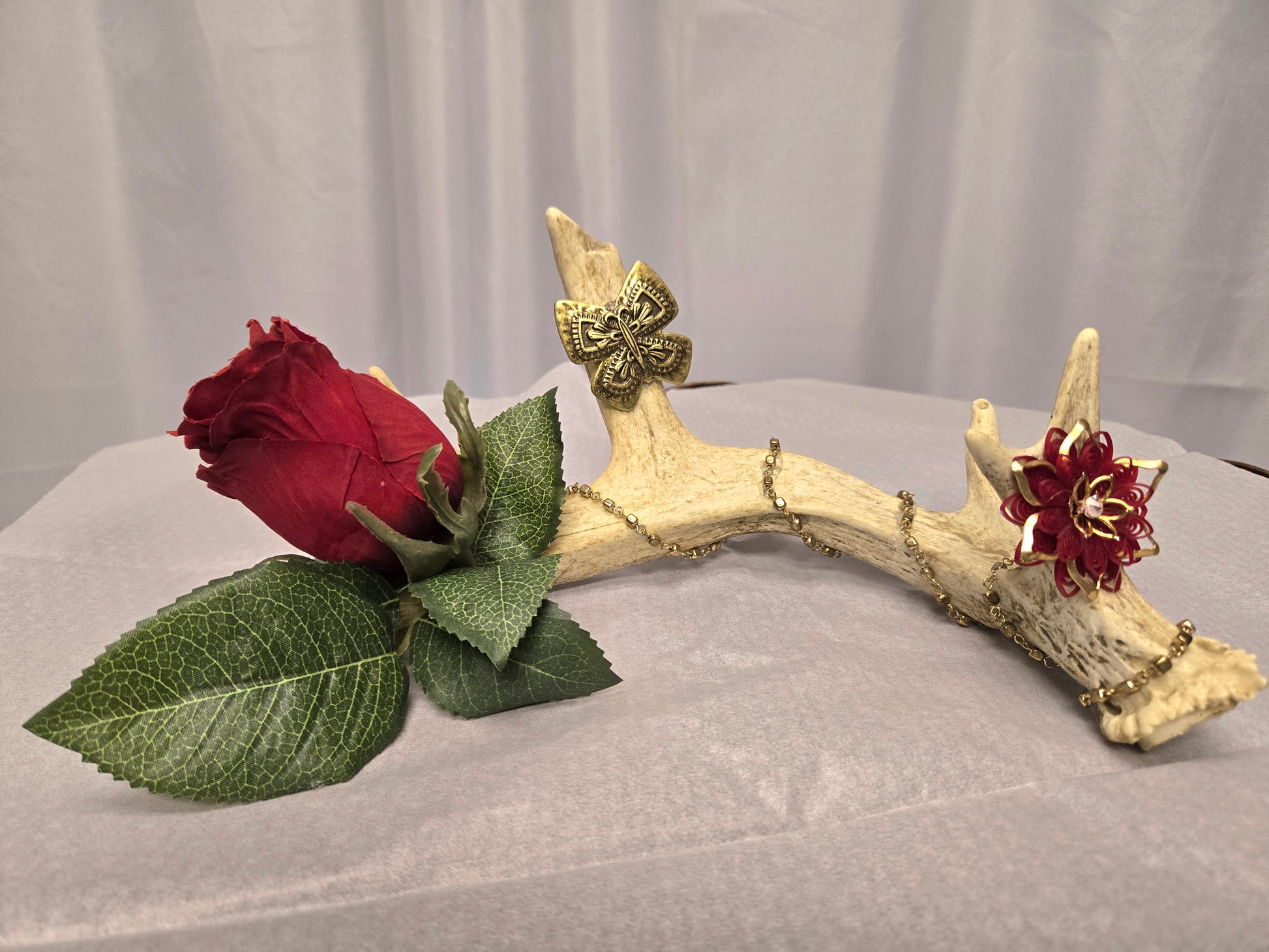 Designer one-of-a-kind natural White-Tail Deer Antler with 5 points.  Embellished with a red rose, antique gold chains, butterfly and flower.  Approximately 10" in length.