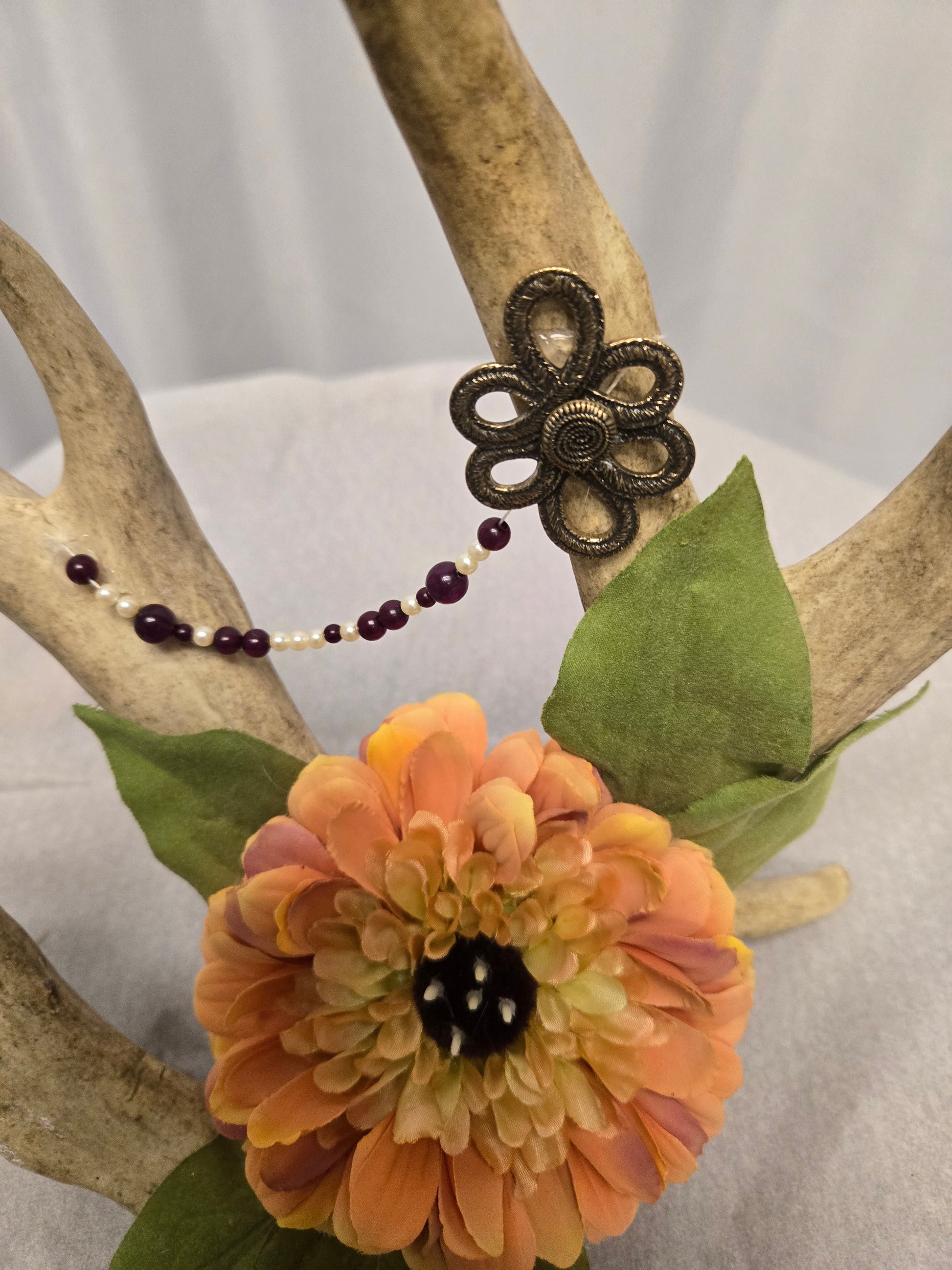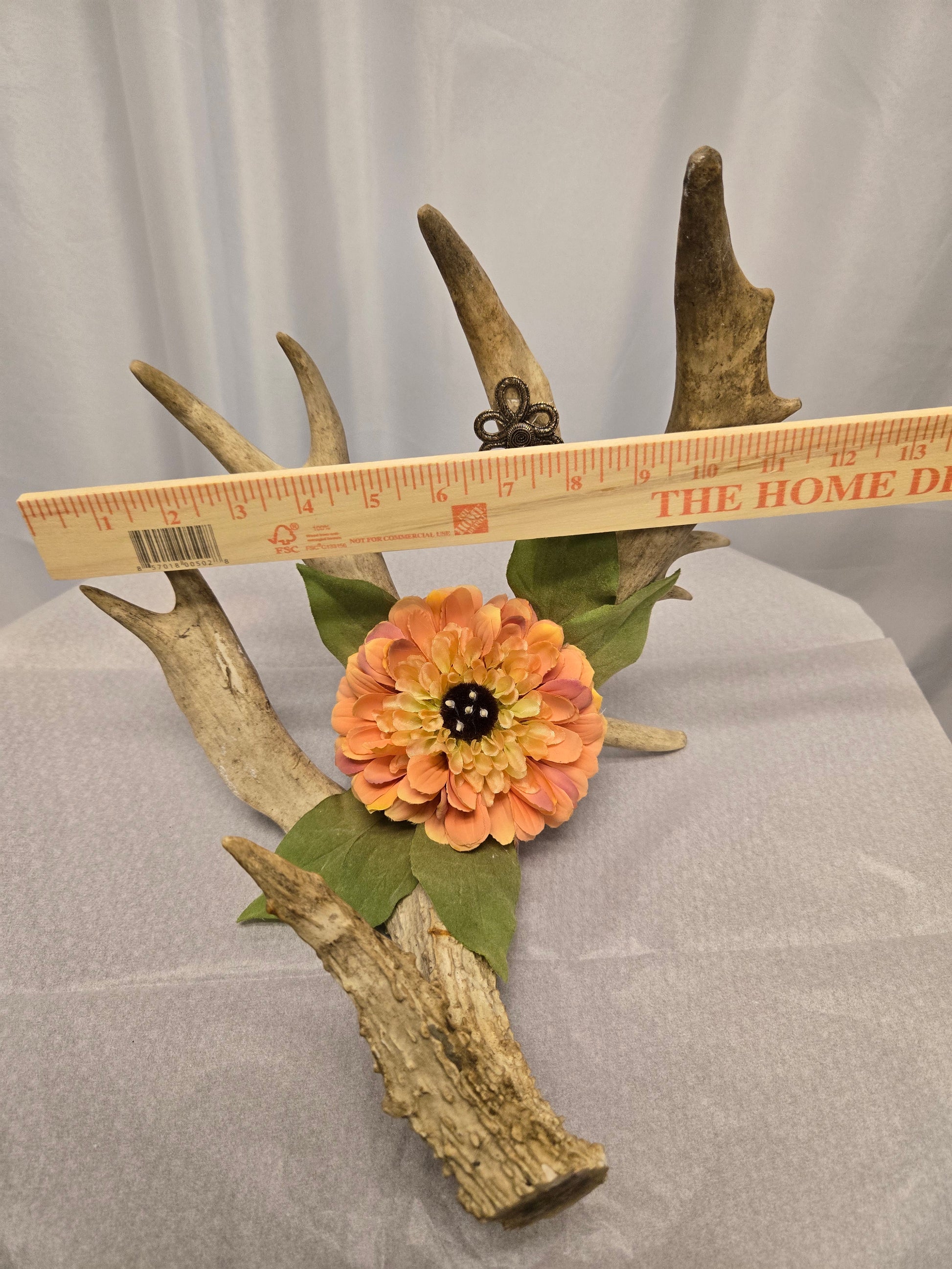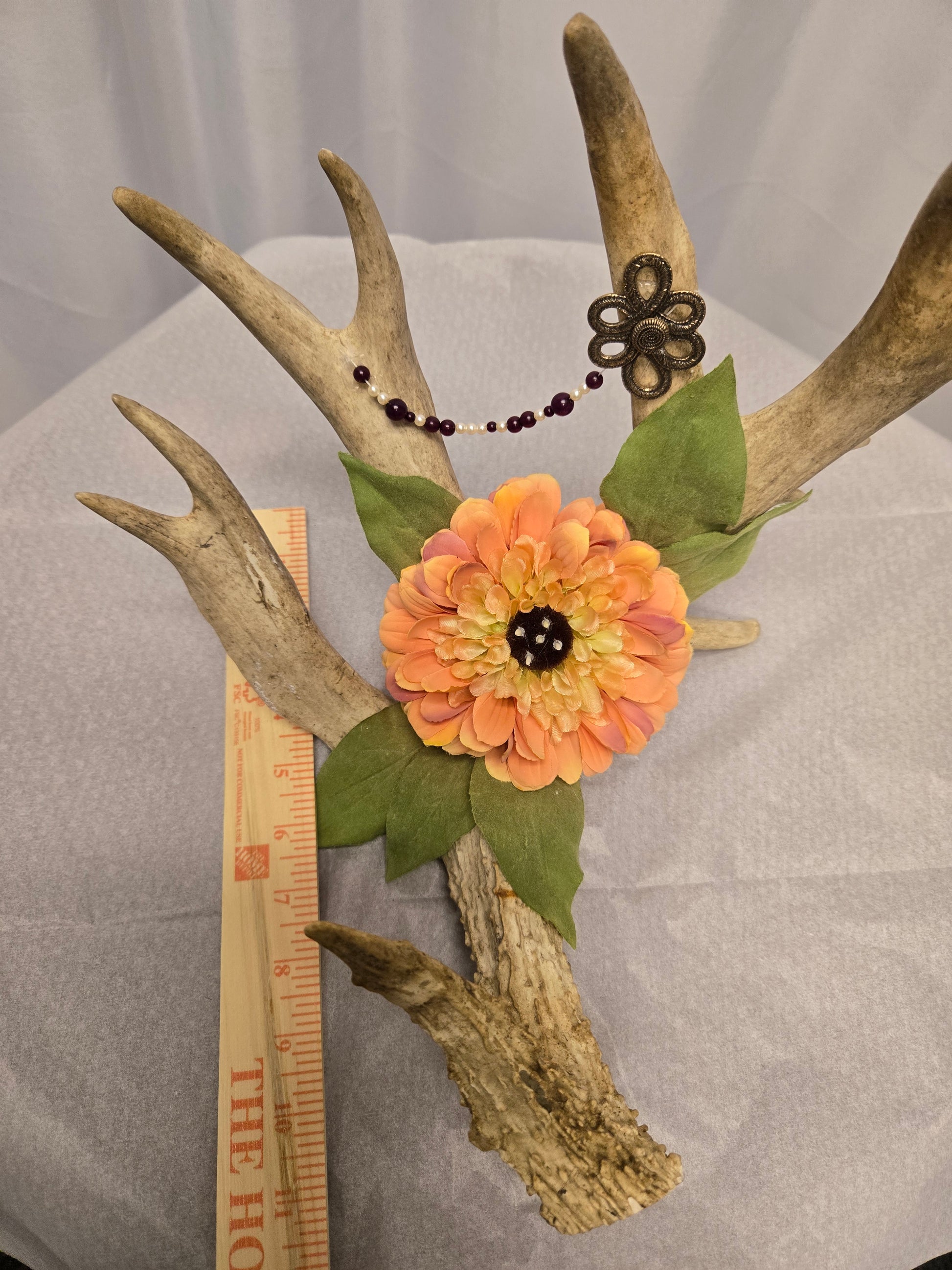 Designer, one-of-a-kind natural White-Tail Deer Antler with multiple points. Embellished with an orange flower and metal brooch and beads in shades of brown and cream. Approximately 12"x12"x12".